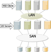 GPFS采用了水平結構的設計,支持SAN組織形式或NSD組織形式(或兩者的混合),在架構上每一層都可以得到擴展,避免了互相的牽連性以及性能的制約性