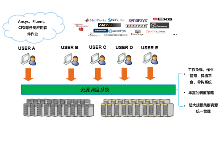 支持異構的、多操作系統,多集群擴展,多集群負載調度,多集群許可證調度,多集群資源管理,作業管理,作業控制,作業資源使用限制,并行作業運行資源使用統計,各種并行作業,海量作業提交和調度,并行作業控制,并行作業容錯,高級預約功能、回填、搶占,絕對優先級,獨占等多種調度策略,基于GPU的調度,具備多種MPI實現方式,包括MPICH,OPEN MPI,INTEL MPI,PE,PLATFORM MPI等。