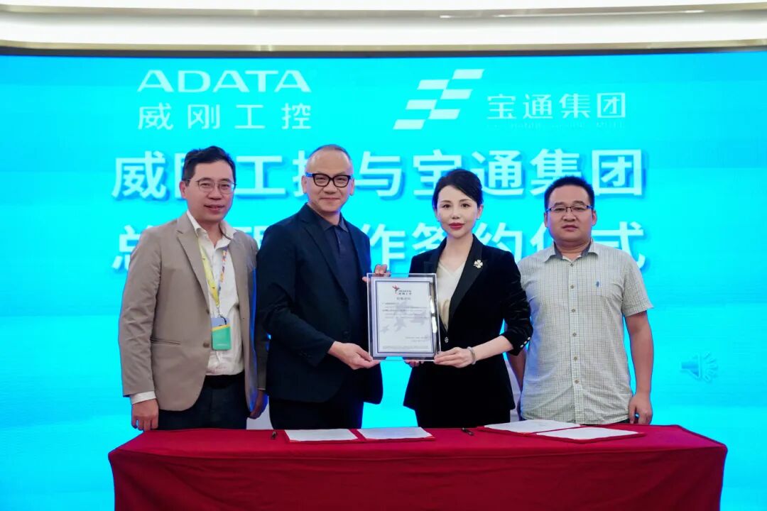 雙方簽約合影,從左至右為: 威剛科技工控事業群大中華業務總監王皓正?威剛科技工控事業群副總張振纮?寶通集團總經理何麗?寶通集團產品總監李濤